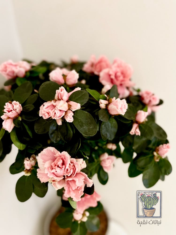 نبتة أزاليا ( Indian Azalea ) ذات أزهار الوردية في حوض فايبر رصاصي، من النباتات المزهرة والمعمرة، أزهاره ذات ألوان متعددة، كما يمكن أن يكون الزهر له لونين مختلفين في الصنف الواحد، تتراوح ألوانه بين الأبيض والوردي والأحمر والأرجواني، يمكن وضعها في صالات الجلوس.