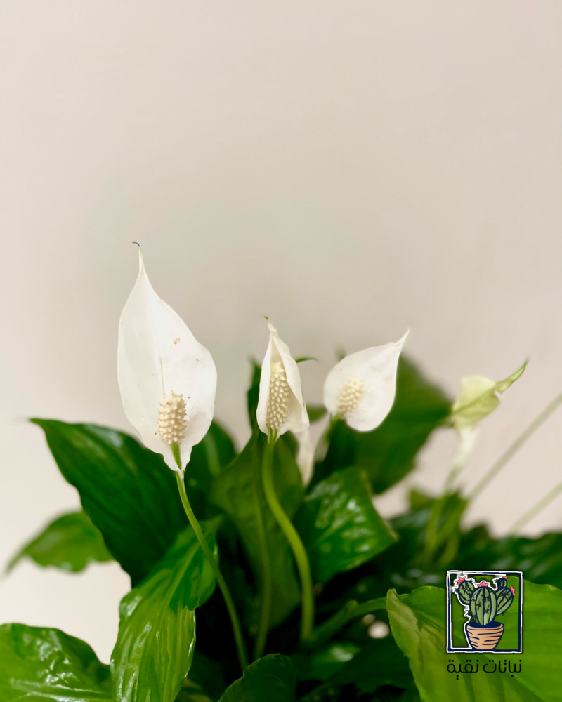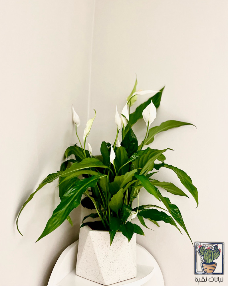 نبتة الأشرعة البيضاء او سباثيفيليوم او زنبق السلام (Spathiphyllum wallisii) في حوض سراميك مضلع اللون ابيض انيق . وهي من النباتات المنقية للجو، تتميز بمظهر أنيق وزهور بيضاء جميلة، يمكن وضعها في غرف النوم أو في صالات الجلوس.