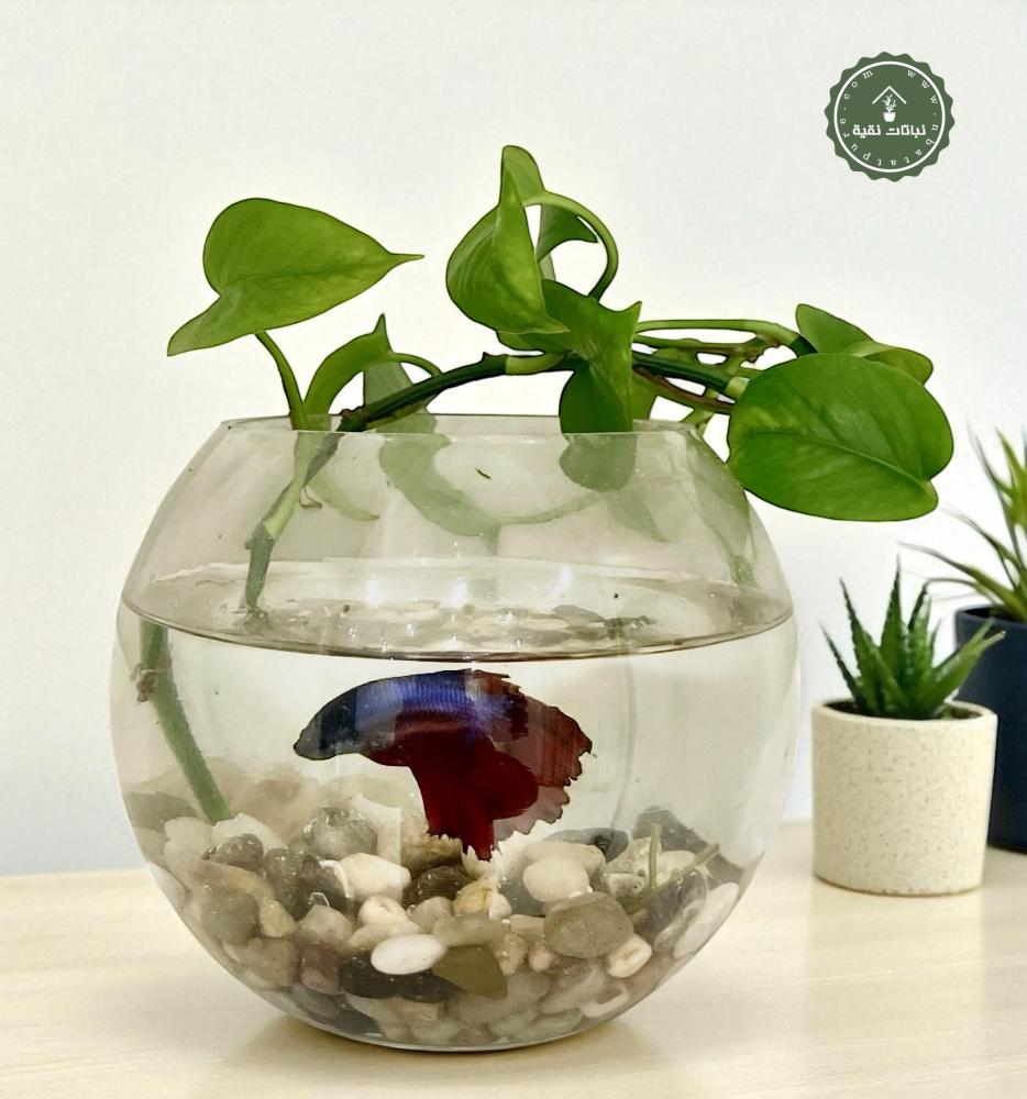 نبتة بوتس المائية فمع سمكة فايتر في فازة زجاجية جميلة.يعتبر نبات البوتس من النباتات الداخلية المتسلقة القوية لتحملها درجات الحرارة وقلة الضوء، وتتميز بتنقيتها للجو ويمكن وضعها في صالات الجلوس او طاولة الطعام او المداخل.