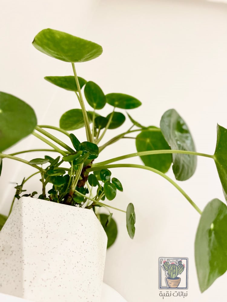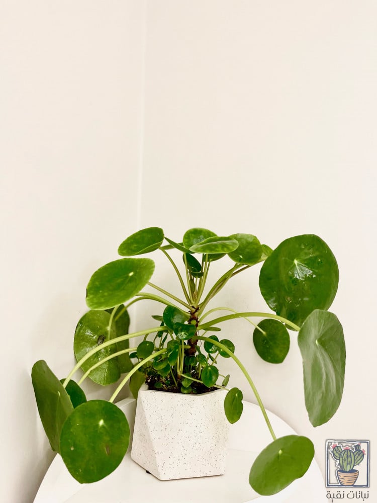 نبتة بيليا (Pilea peperomioides) في حوض سراميك مضلع اللون ابيض انيق. من النباتات الداخلية التي لاتحتاج للكثير من العناية، يمكن وضعها في المنزل أو في بيئات العمل.