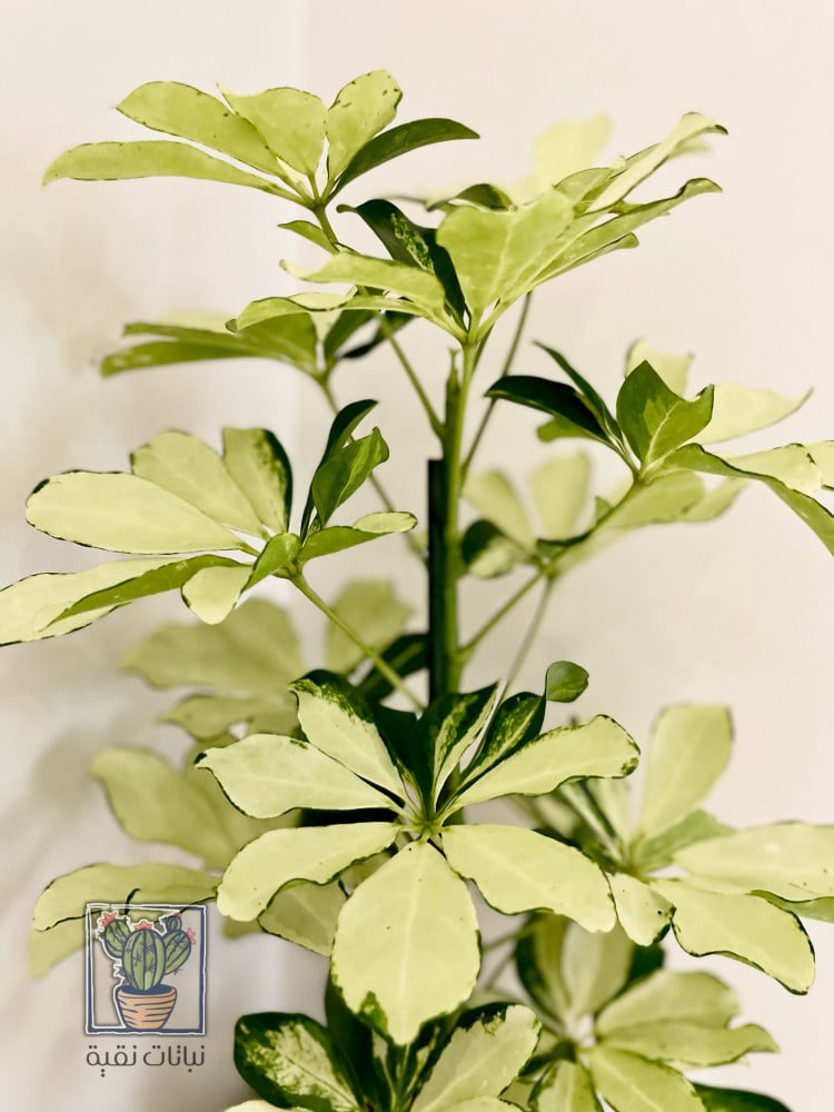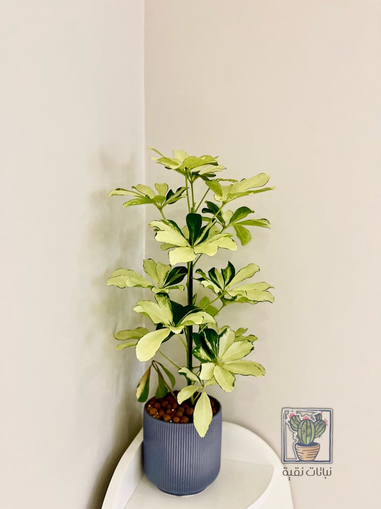 نبتة الشفليرا البيضاء (Schefflera ) في حوض سراميك اللون ازرق ،نبتة ذات أوراق بيضاء فاتحة ولامعة، تعتبر من النباتات السهلة في العناية والجميلة المظهر، يمكن وضعها في المنازل أو بيئات العمل المختلفة.