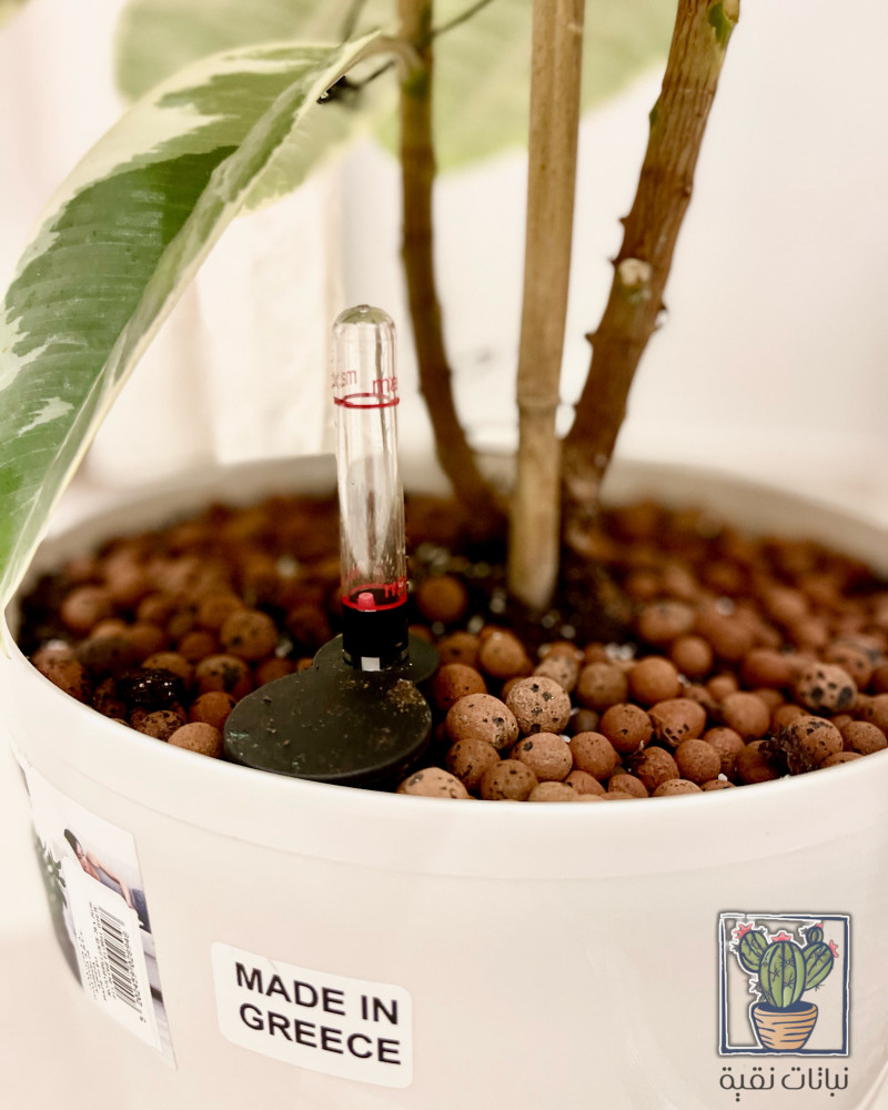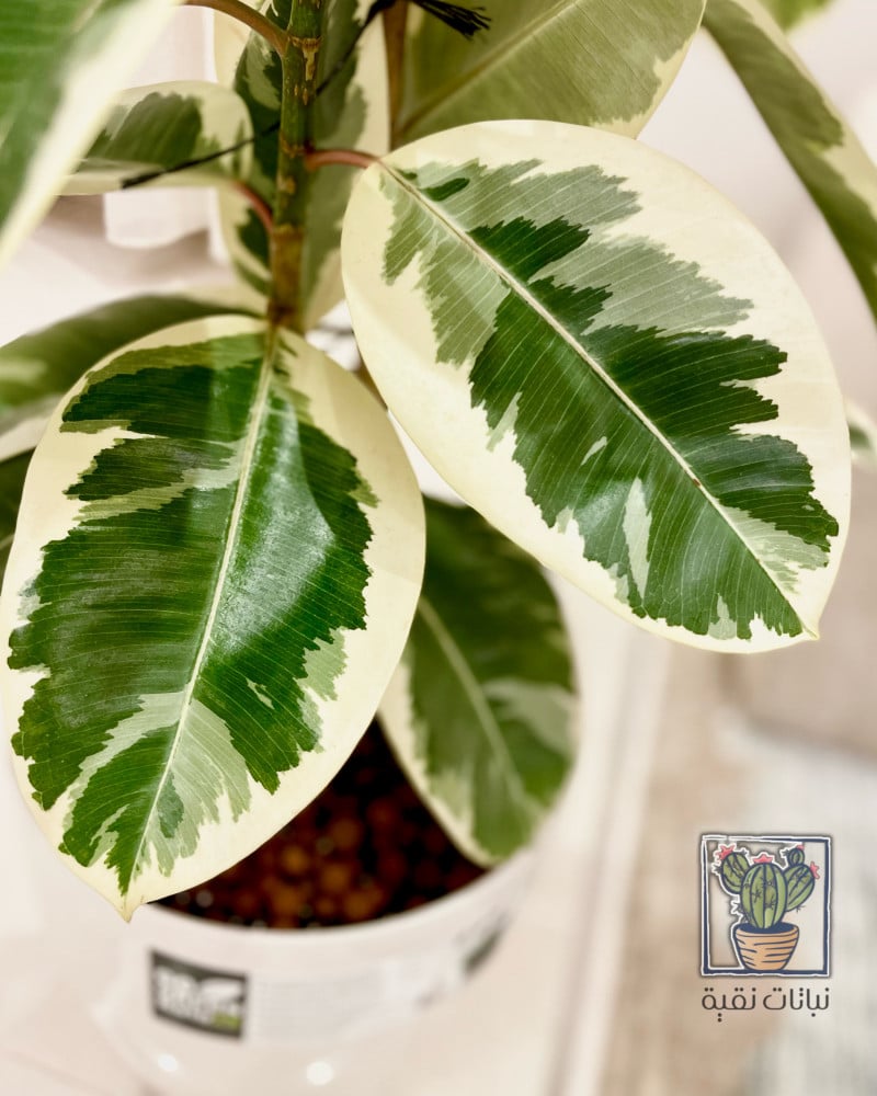 نبتة فيكس مطاط ذات أوراق مبرقشة في حوض ري ذاتي اللون ابيض انيق. وهي من النباتات الداخلية الطبيعية المميزة بأوراقها اللامعة المبرقشة، وهي من النباتات سهله العنية ويفضل مسح أوراقها بقطعة قماش ناعمة للمحافظة على لمعان و صحة النبات، يمكن وضعها داخل المنازل أو بيئات العمل المختلفة بعيداً عن أشعة الشمس المباشرة.