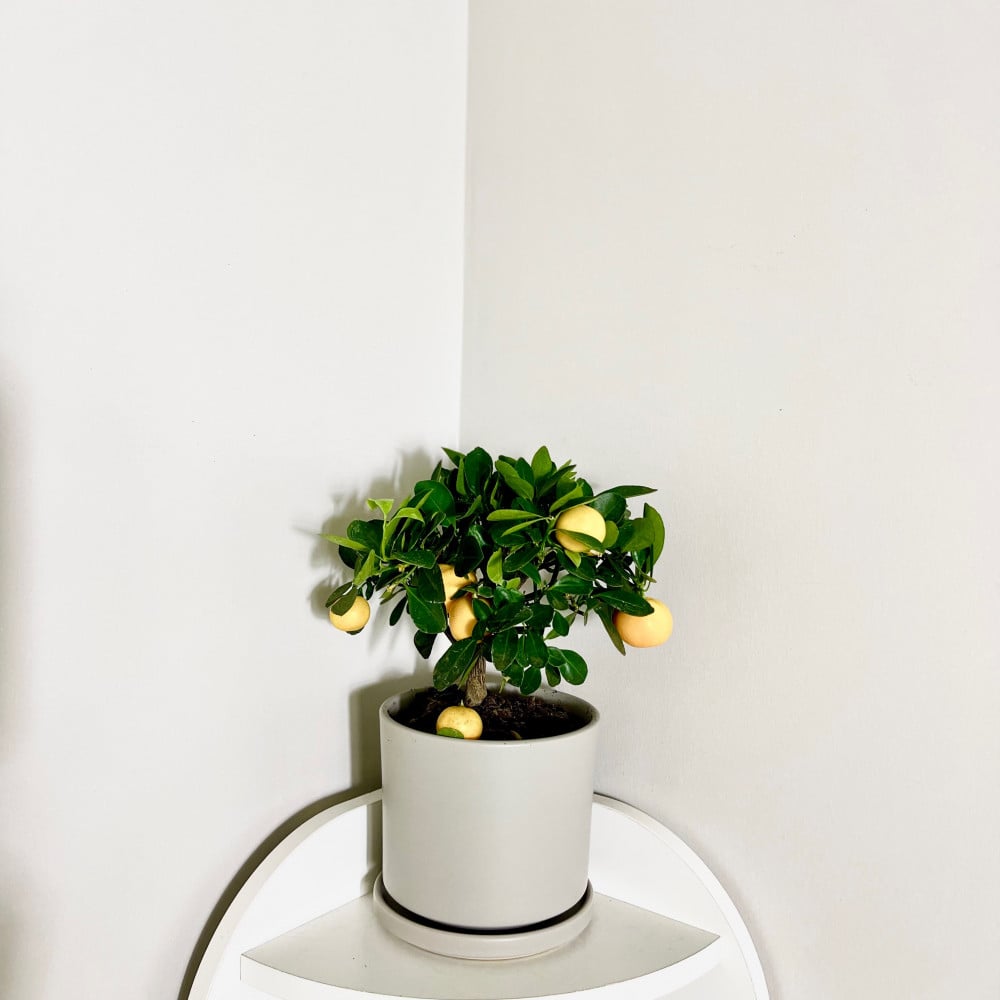 نبتة كلمنتينا في حوض سيراميك اللون رمادي فاتح انيق. تعتبر من النباتات الحمضية وهي من الحمضيات الاكثر شهرة ومحببة لدى الناس وهي شبيهه بما يعرف ( باليوسفندي )وتتميز بأورقها دائمة الخضرة و زهورها الجميلة العطرة.